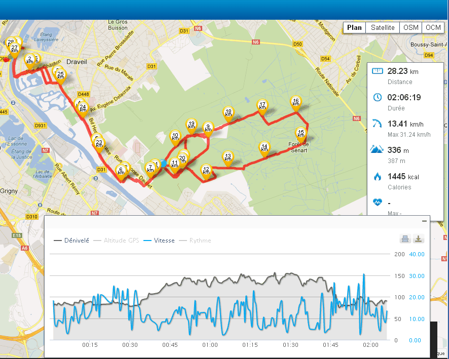 Lors de l’échauffement, je me suis dirigé vers la forêt du Sénart afin d’évité le monde en ce dimanche ensoleillé. Lors des 1er kilomètre, mon câble de dérailleur à sauté (mauvais serrage) et je me suis vue bloqué sur le second pignon et grand plateau. J’ai essayer malgré tout de suivre mon programme mais le résultat est peu concluant pour mon gout.
